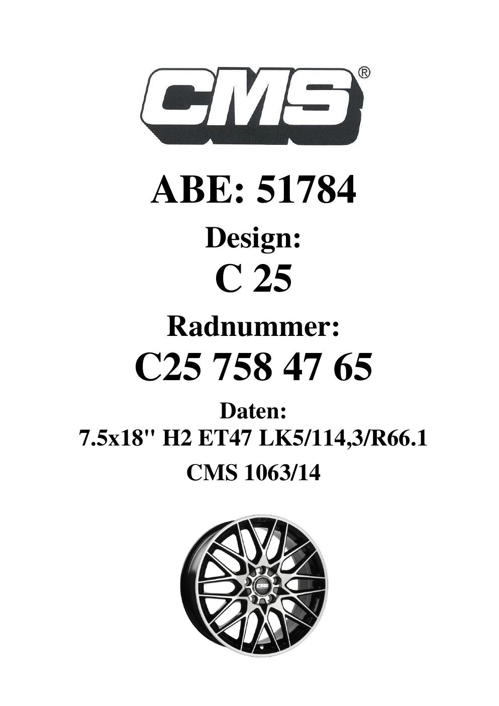 Dieses Gutachten (ABE) bezieht sich auf die Alufelge CMS C25 in der Ausführung 7.5Jx18 ET 0, Mittenloch 0 mm (KBA 51784). Im PDF findest du typischerweise zulässige Reifengrößen, Auflagen/Anbauhinweise und – je nach Dokument – Hinweise zur Eintragung.