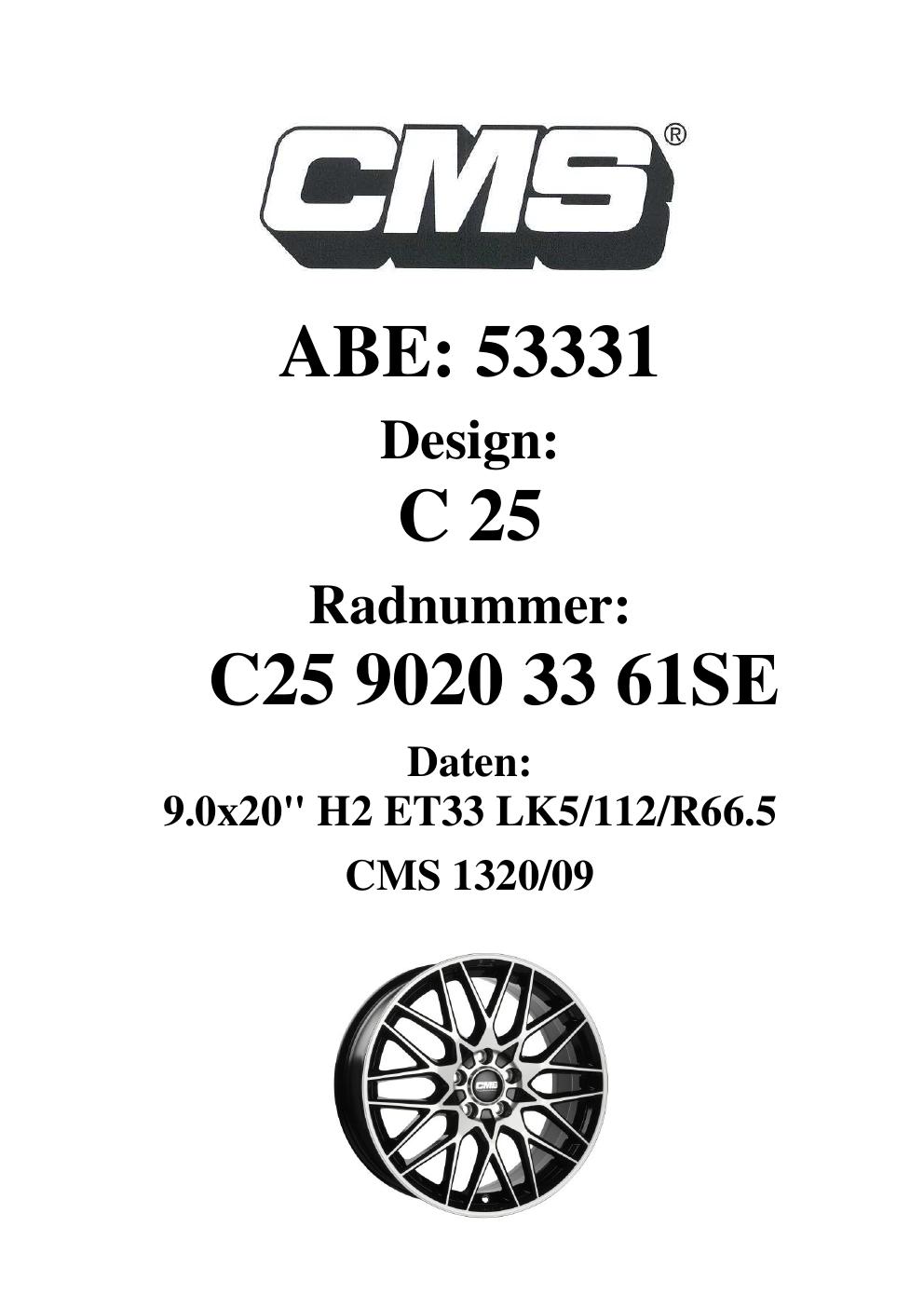 Dieses Gutachten (ABE) bezieht sich auf die Alufelge CMS C25 in der Ausführung 9Jx2 ET 0, Mittenloch 0 mm (KBA 53331). Im PDF findest du typischerweise zulässige Reifengrößen, Auflagen/Anbauhinweise und – je nach Dokument – Hinweise zur Eintragung.