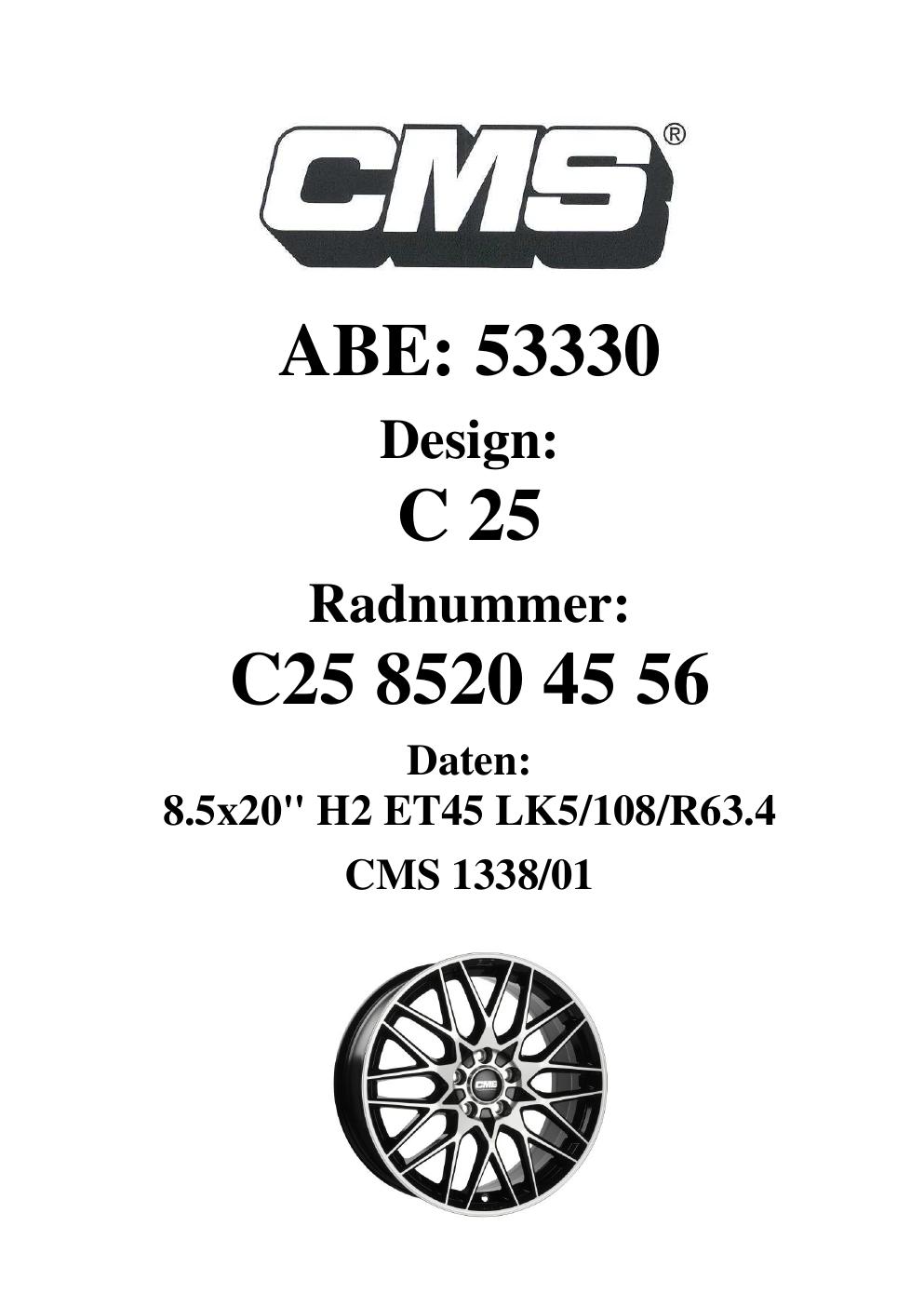Dieses Gutachten (ABE) bezieht sich auf die Alufelge CMS C25 in der Ausführung 8.5Jx2 ET 0, Mittenloch 0 mm (KBA 53330). Im PDF findest du typischerweise zulässige Reifengrößen, Auflagen/Anbauhinweise und – je nach Dokument – Hinweise zur Eintragung.
