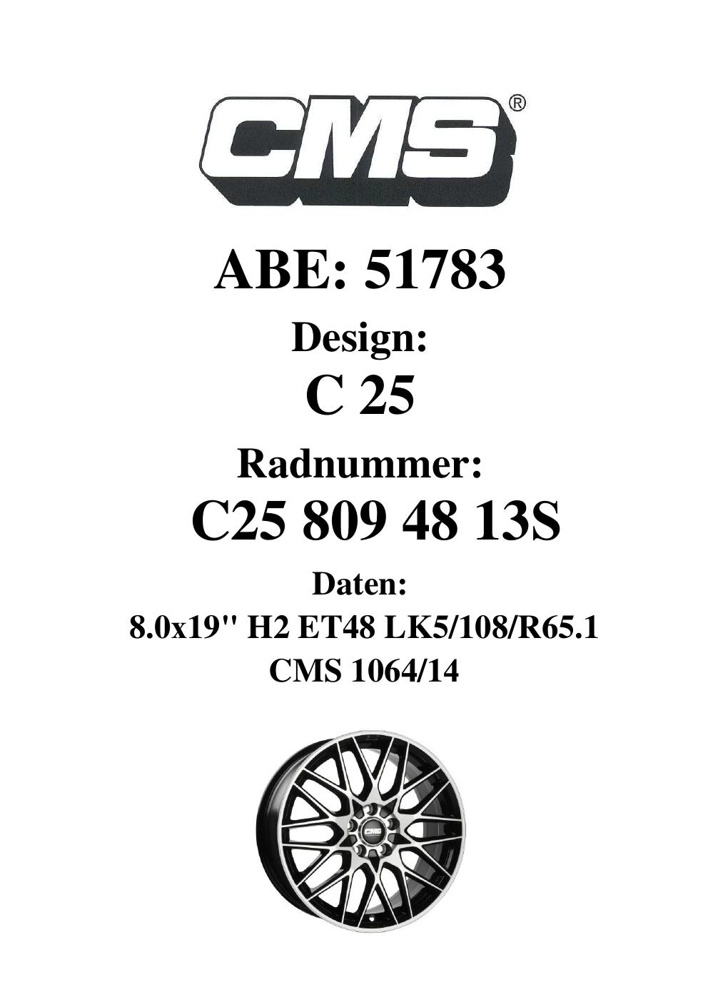 Dieses Gutachten (ABE) bezieht sich auf die Alufelge CMS C25 in der Ausführung 8Jx19 ET 0, Mittenloch 0 mm (KBA 51783). Im PDF findest du typischerweise zulässige Reifengrößen, Auflagen/Anbauhinweise und – je nach Dokument – Hinweise zur Eintragung.
