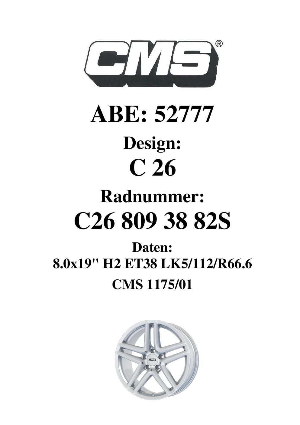 Dieses Gutachten (ABE) bezieht sich auf die Alufelge CMS C26 in der Ausführung 8Jx19 ET 0, Mittenloch 0 mm (KBA 52777). Im PDF findest du typischerweise zulässige Reifengrößen, Auflagen/Anbauhinweise und – je nach Dokument – Hinweise zur Eintragung.