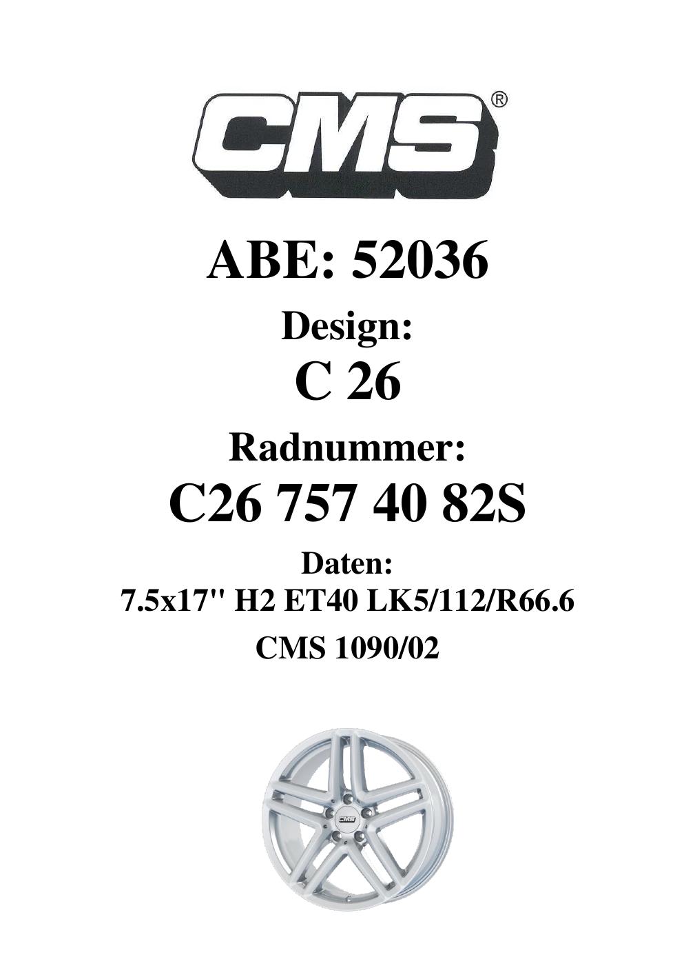 Dieses Gutachten (ABE) bezieht sich auf die Alufelge CMS C26 in der Ausführung 7.5Jx17 ET 0, Mittenloch 0 mm (KBA 52036). Im PDF findest du typischerweise zulässige Reifengrößen, Auflagen/Anbauhinweise und – je nach Dokument – Hinweise zur Eintragung.