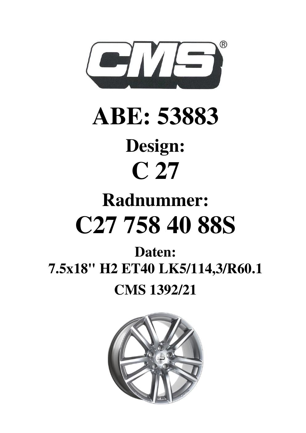 Dieses Gutachten (ABE) bezieht sich auf die Alufelge CMS C27 in der Ausführung 7.5Jx18 ET 0, Mittenloch 0 mm (KBA 53883). Im PDF findest du typischerweise zulässige Reifengrößen, Auflagen/Anbauhinweise und – je nach Dokument – Hinweise zur Eintragung.