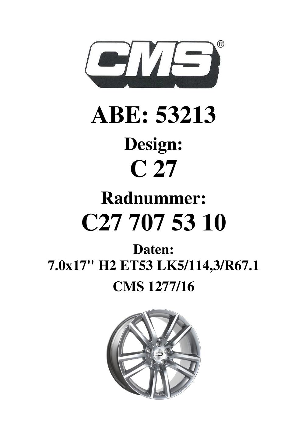 Dieses Gutachten (ABE) bezieht sich auf die Alufelge CMS C27 in der Ausführung 7Jx17 ET 0, Mittenloch 0 mm (KBA 53213). Im PDF findest du typischerweise zulässige Reifengrößen, Auflagen/Anbauhinweise und – je nach Dokument – Hinweise zur Eintragung.