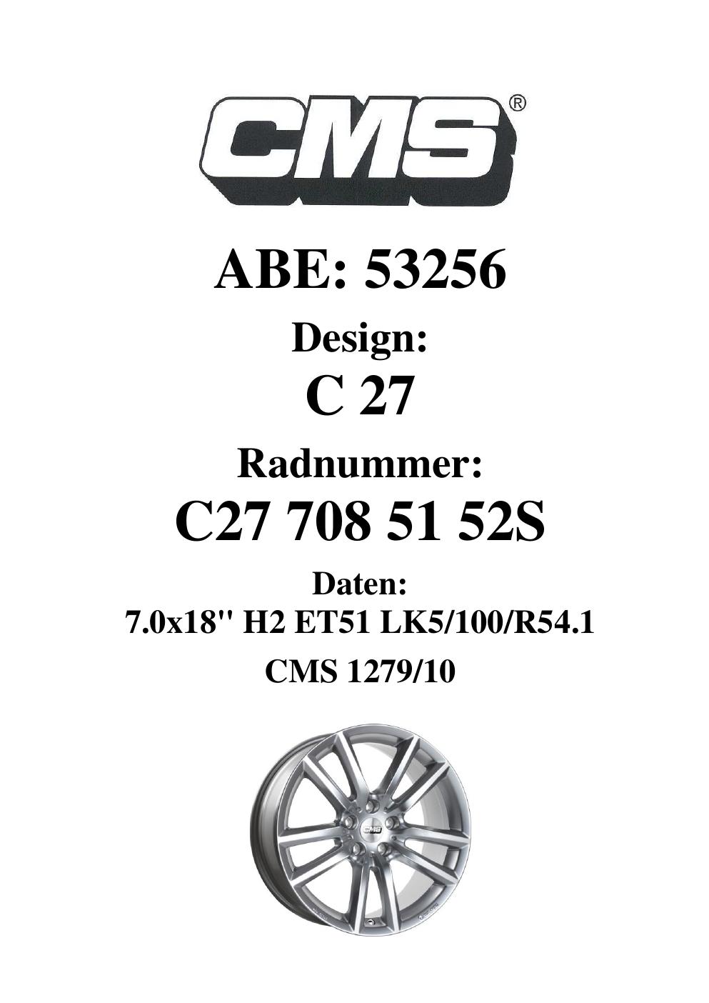 Dieses Gutachten (ABE) bezieht sich auf die Alufelge CMS C27 in der Ausführung 7Jx18 ET 0, Mittenloch 0 mm (KBA 53256). Im PDF findest du typischerweise zulässige Reifengrößen, Auflagen/Anbauhinweise und – je nach Dokument – Hinweise zur Eintragung.