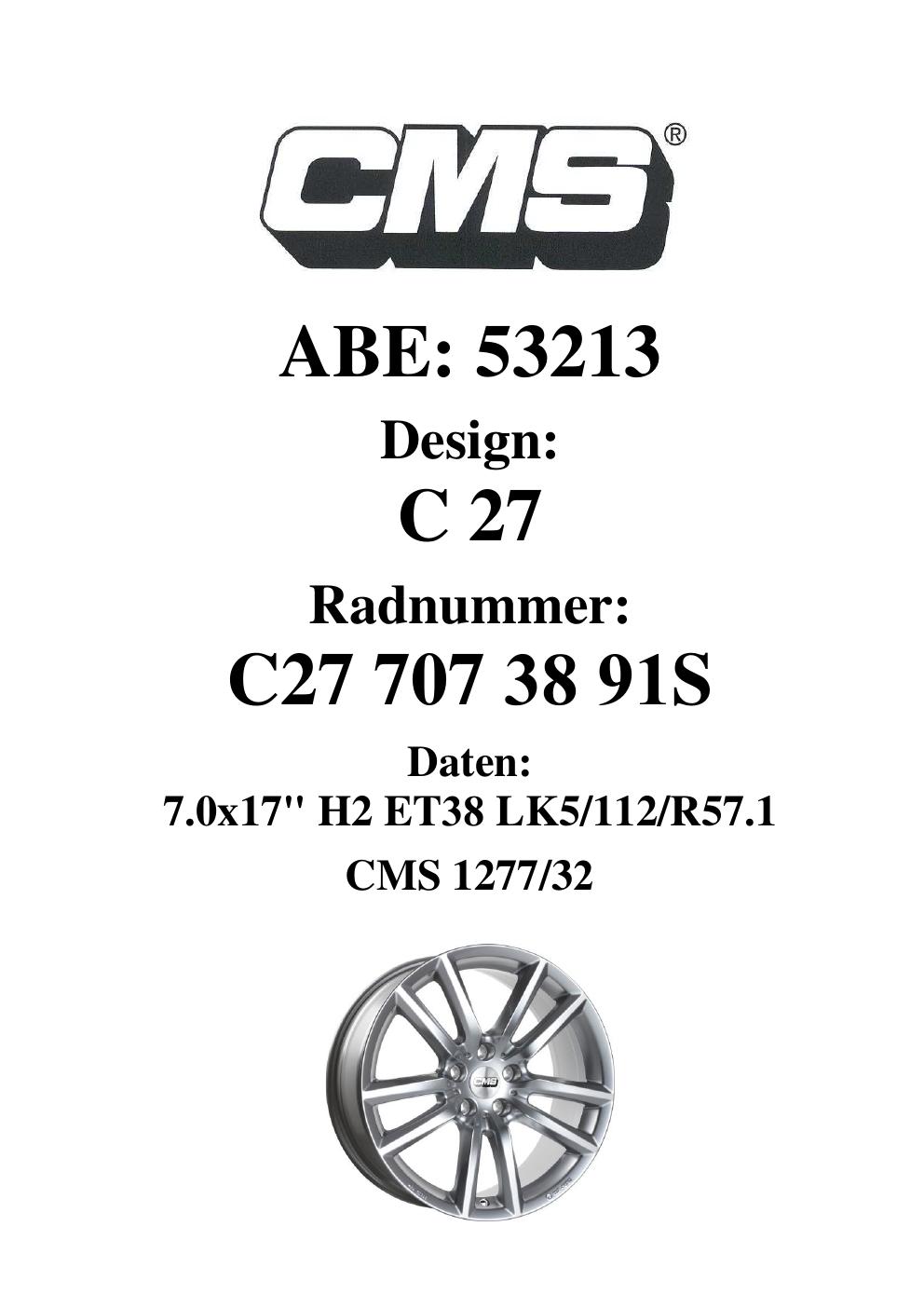 Dieses Gutachten (ABE) bezieht sich auf die Alufelge CMS C27 in der Ausführung 7Jx17 ET 0, Mittenloch 0 mm (KBA 53213). Im PDF findest du typischerweise zulässige Reifengrößen, Auflagen/Anbauhinweise und – je nach Dokument – Hinweise zur Eintragung.