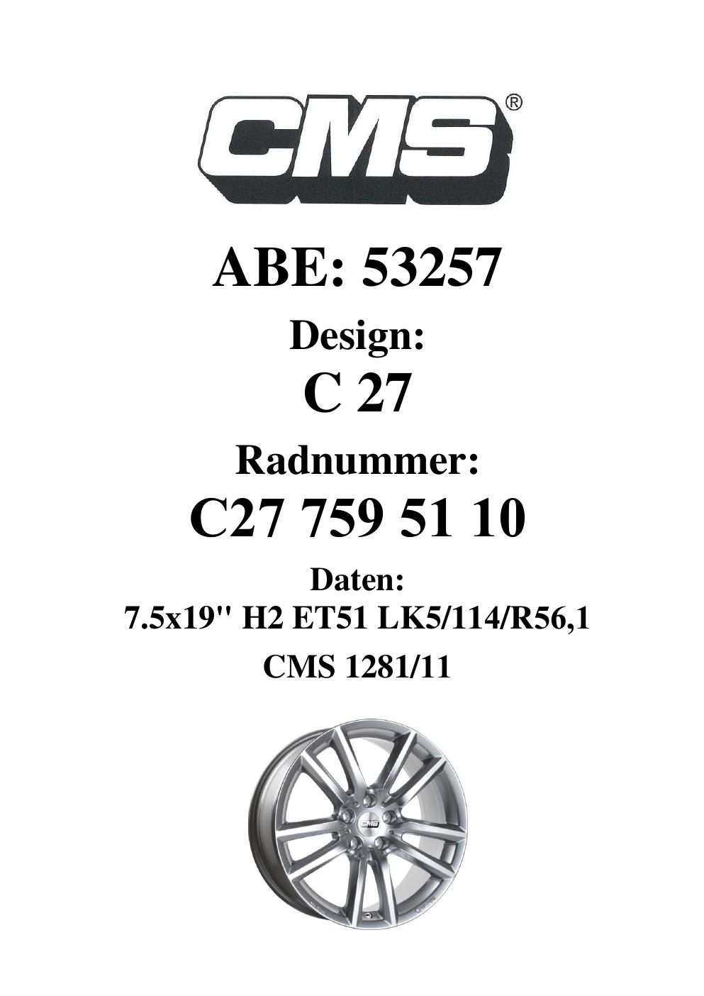 Dieses Gutachten (ABE) bezieht sich auf die Alufelge CMS C27 in der Ausführung 7.5Jx19 ET 0, Mittenloch 0 mm (KBA 53257). Im PDF findest du typischerweise zulässige Reifengrößen, Auflagen/Anbauhinweise und – je nach Dokument – Hinweise zur Eintragung.