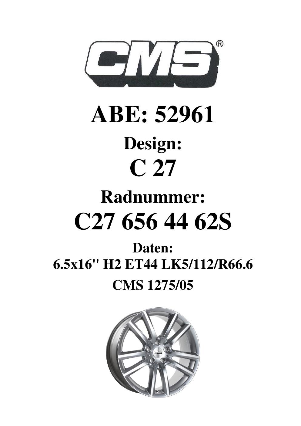 Dieses Gutachten (ABE) bezieht sich auf die Alufelge CMS C27 in der Ausführung 6.5Jx16 ET 0, Mittenloch 0 mm (KBA 52961). Im PDF findest du typischerweise zulässige Reifengrößen, Auflagen/Anbauhinweise und – je nach Dokument – Hinweise zur Eintragung.