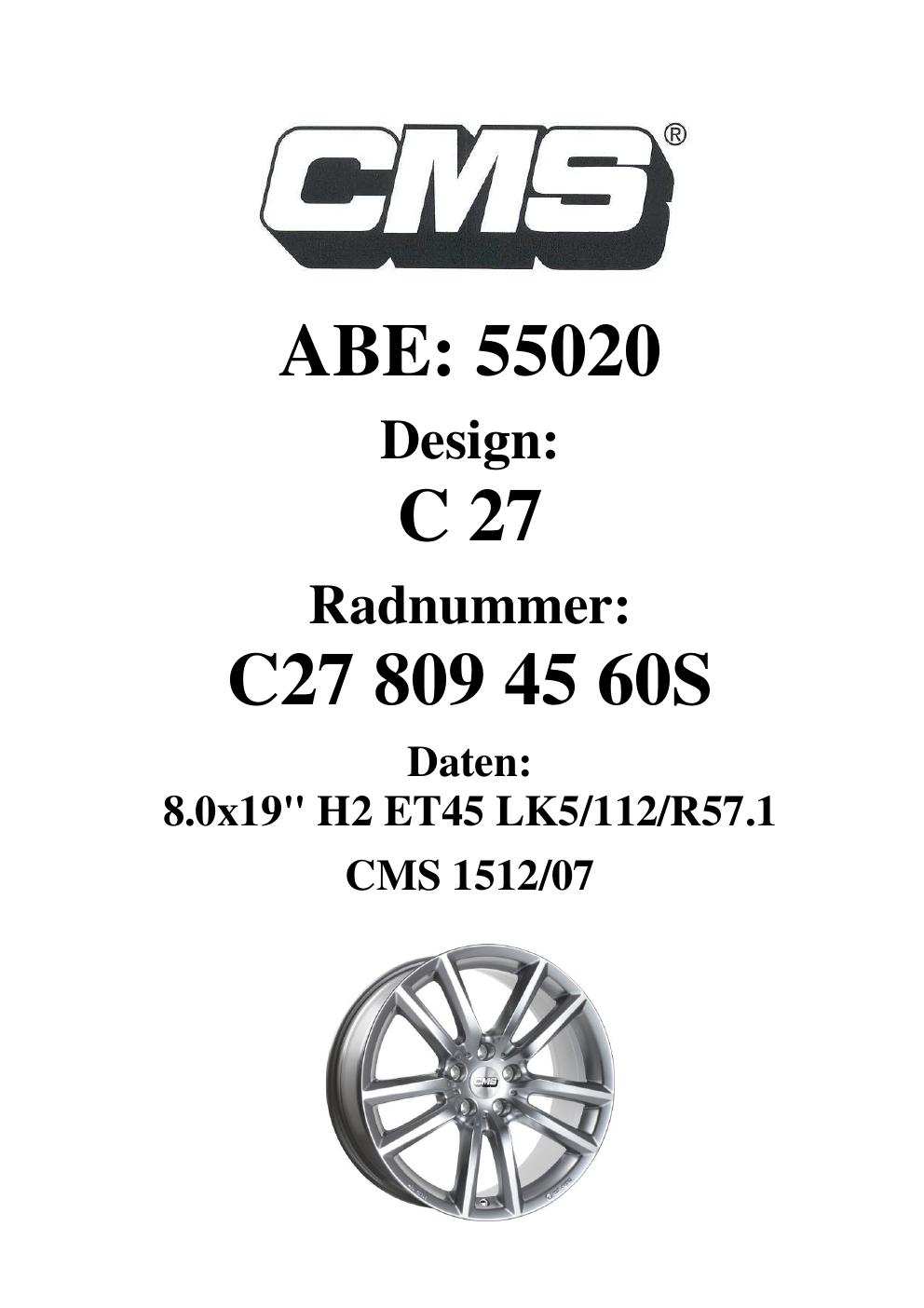 Felgengutachten / ABE für Alufelgen CMS C27 (8Jx19 ET 0, Mittenloch 0 mm) mit KBA 55020 (Zertifikatsnummer 55020). Hier kostenlos als PDF herunterladen. Der Download-Link ist 24 Stunden gültig und kann bis zu zwei Mal verwendet werden.