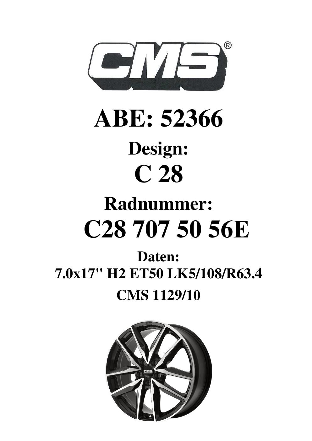 Dieses ABE gehört zur Felge CMS C28 in 7Jx17 ET0 mit KBA 52366. Die Seite ist dafür gedacht, dass du schnell prüfen kannst, ob KBA, Design und Größe zu deiner Felge passen und danach direkt das richtige PDF lädst.