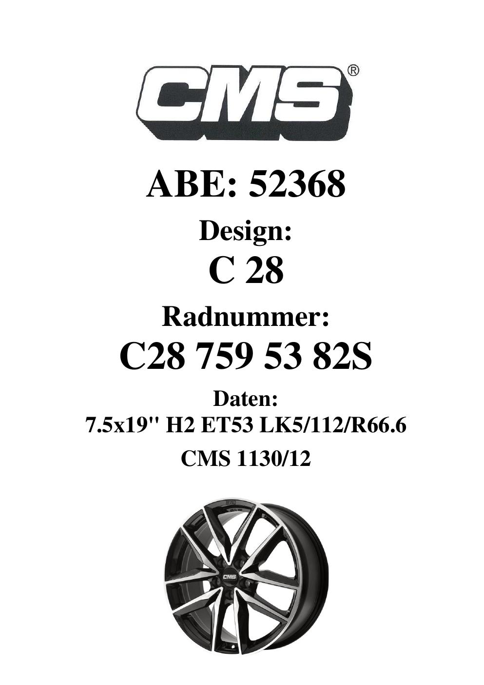 Dieses Gutachten (ABE) bezieht sich auf die Alufelge CMS C28 in der Ausführung 7.5Jx19 ET 0, Mittenloch 0 mm (KBA 52368). Im PDF findest du typischerweise zulässige Reifengrößen, Auflagen/Anbauhinweise und – je nach Dokument – Hinweise zur Eintragung.