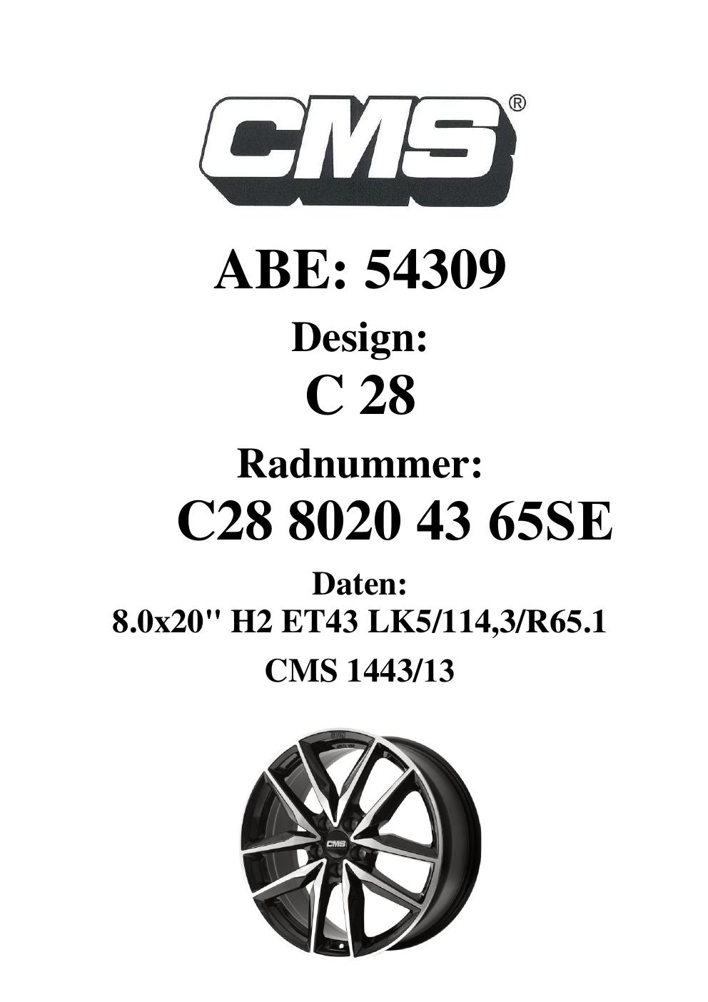 Dieses Gutachten (ABE) bezieht sich auf die Alufelge CMS C28 in der Ausführung 8Jx2 ET 0, Mittenloch 0 mm (KBA 54309). Im PDF findest du typischerweise zulässige Reifengrößen, Auflagen/Anbauhinweise und – je nach Dokument – Hinweise zur Eintragung.
