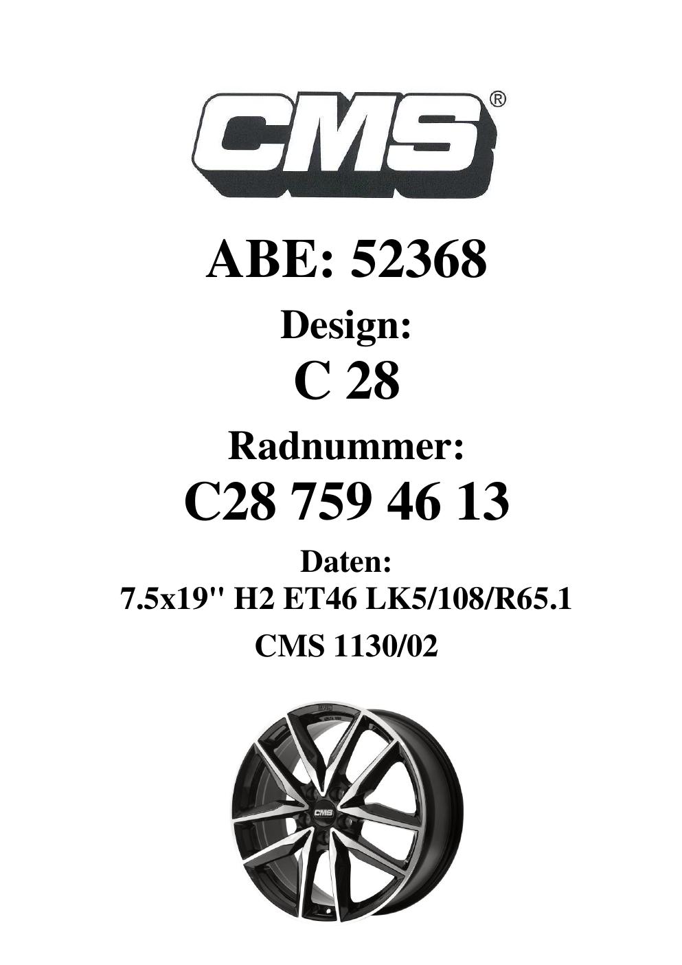 Dieses Gutachten (ABE) bezieht sich auf die Alufelge CMS C28 in der Ausführung 7.5Jx19 ET 0, Mittenloch 0 mm (KBA 52368). Im PDF findest du typischerweise zulässige Reifengrößen, Auflagen/Anbauhinweise und – je nach Dokument – Hinweise zur Eintragung.