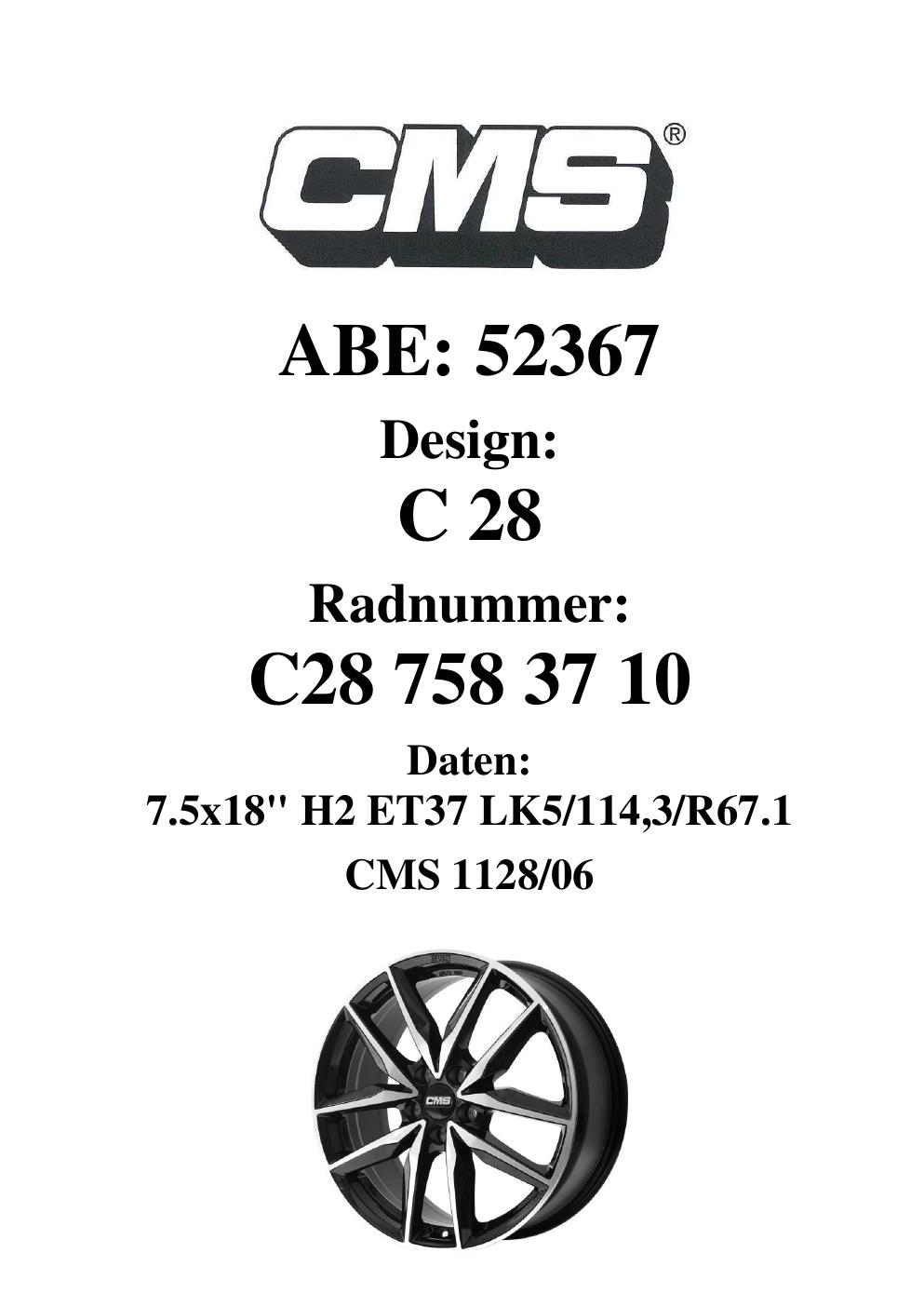 Dieses Gutachten (ABE) bezieht sich auf die Alufelge CMS C28 in der Ausführung 7.5Jx18 ET 0, Mittenloch 0 mm (KBA 52367). Im PDF findest du typischerweise zulässige Reifengrößen, Auflagen/Anbauhinweise und – je nach Dokument – Hinweise zur Eintragung.
