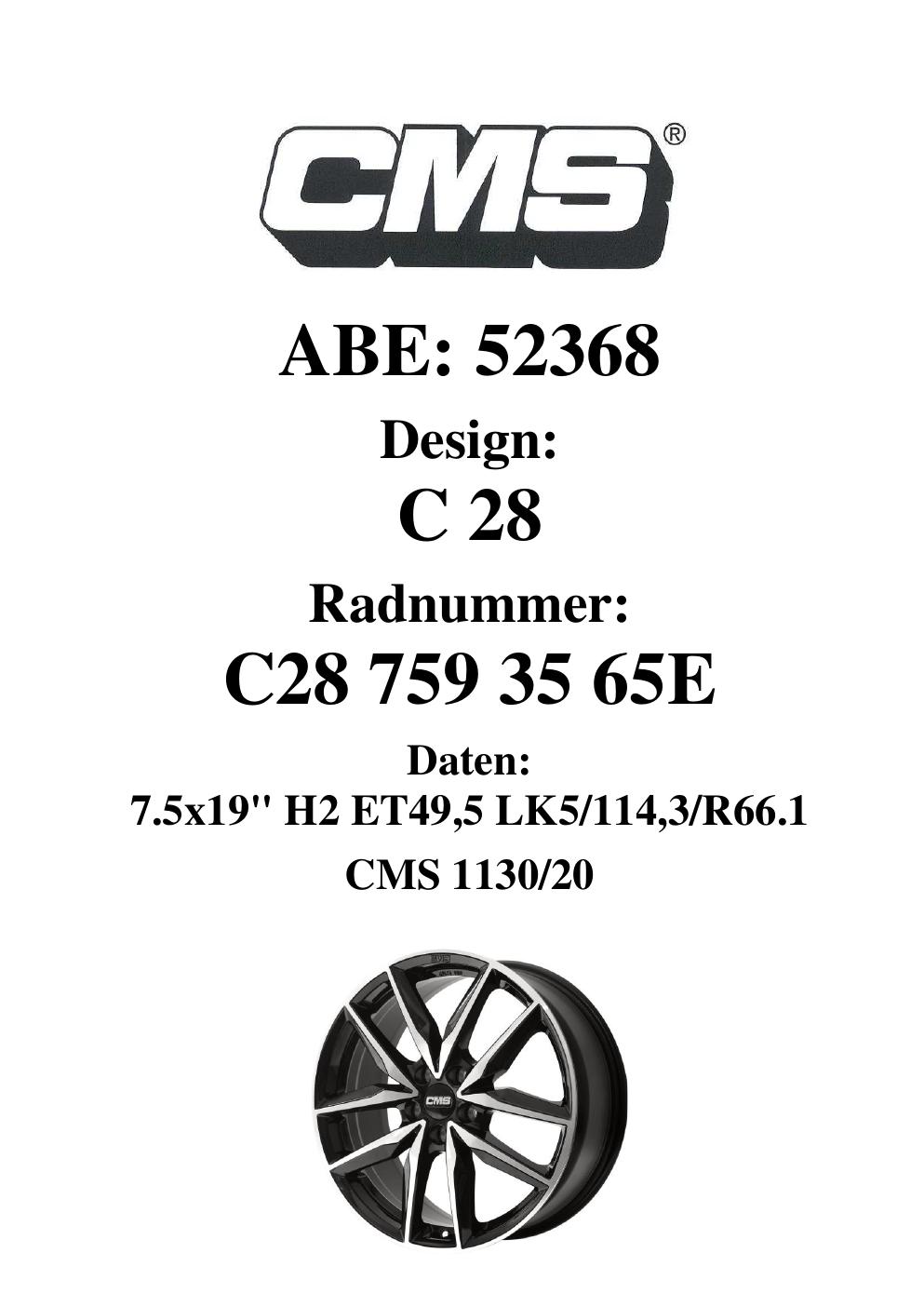 Dieses Gutachten (ABE) bezieht sich auf die Alufelge CMS C28 in der Ausführung 7.5Jx19 ET 0, Mittenloch 0 mm (KBA 52368). Im PDF findest du typischerweise zulässige Reifengrößen, Auflagen/Anbauhinweise und – je nach Dokument – Hinweise zur Eintragung.