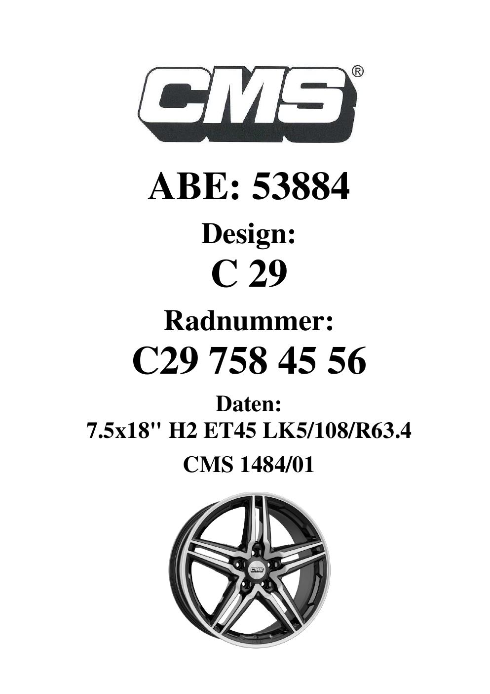 Dieses Gutachten (ABE) bezieht sich auf die Alufelge CMS C29 in der Ausführung 7.5Jx18 ET 0, Mittenloch 0 mm (KBA 53884). Im PDF findest du typischerweise zulässige Reifengrößen, Auflagen/Anbauhinweise und – je nach Dokument – Hinweise zur Eintragung.