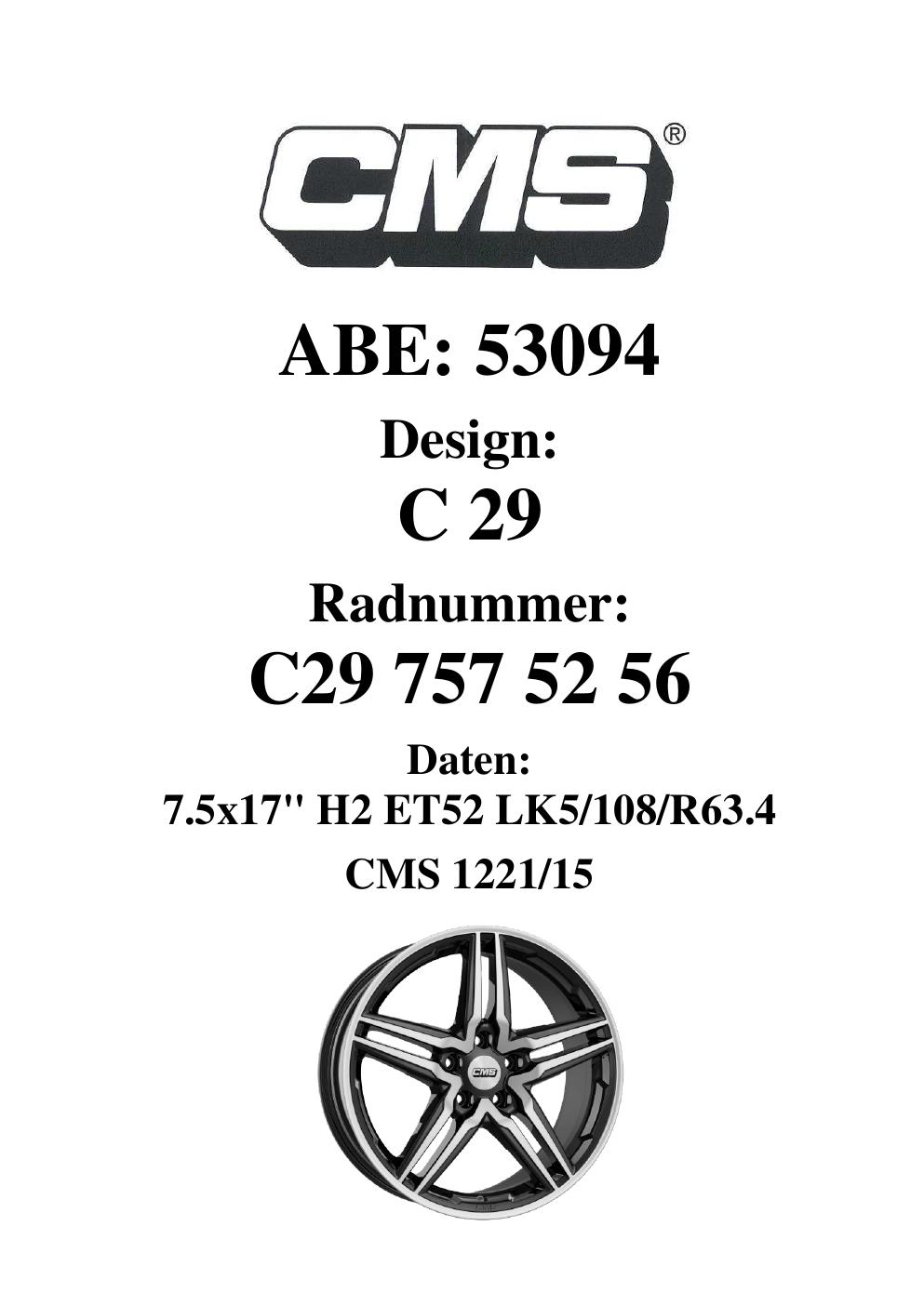 Dieses Gutachten (ABE) bezieht sich auf die Alufelge CMS C29 in der Ausführung 7.5Jx17 ET 0, Mittenloch 0 mm (KBA 53094). Im PDF findest du typischerweise zulässige Reifengrößen, Auflagen/Anbauhinweise und – je nach Dokument – Hinweise zur Eintragung.