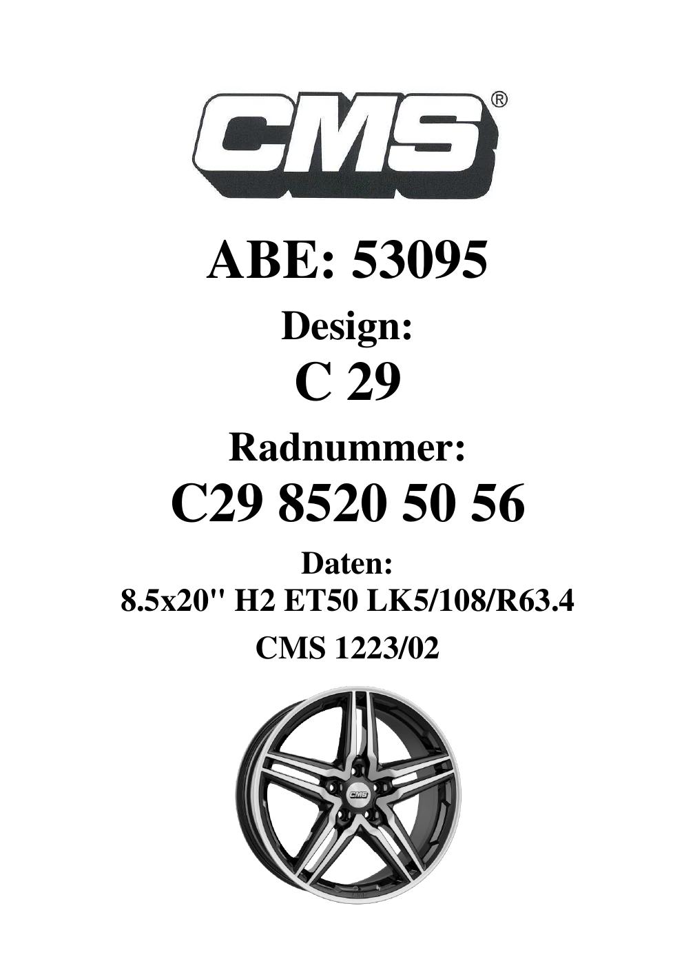 Dieses Gutachten (ABE) bezieht sich auf die Alufelge CMS C29 in der Ausführung 8.5Jx2 ET 0, Mittenloch 0 mm (KBA 53095). Im PDF findest du typischerweise zulässige Reifengrößen, Auflagen/Anbauhinweise und – je nach Dokument – Hinweise zur Eintragung.