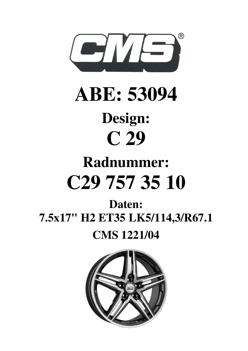 Dieses Gutachten (ABE) bezieht sich auf die Alufelge CMS C29 in der Ausführung 7.5Jx17 ET 0, Mittenloch 0 mm (KBA 53094). Im PDF findest du typischerweise zulässige Reifengrößen, Auflagen/Anbauhinweise und – je nach Dokument – Hinweise zur Eintragung.