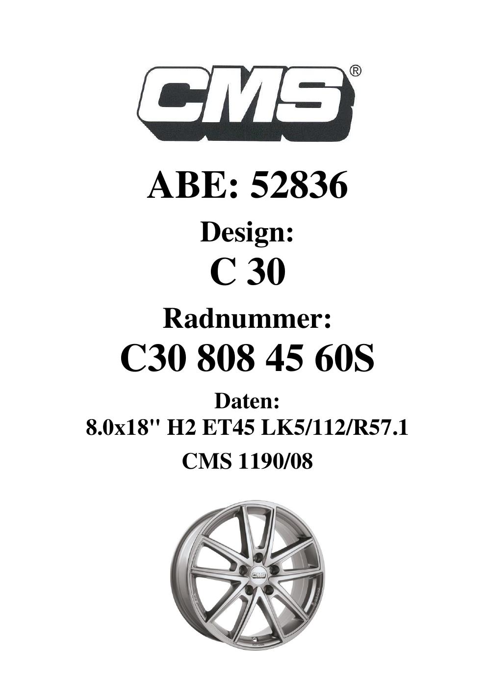 Dieses Gutachten (ABE) bezieht sich auf die Alufelge CMS C30 in der Ausführung 8Jx18 ET 0, Mittenloch 0 mm (KBA 52836). Im PDF findest du typischerweise zulässige Reifengrößen, Auflagen/Anbauhinweise und – je nach Dokument – Hinweise zur Eintragung.