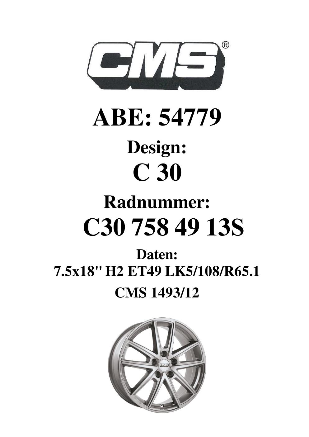 Dieses Gutachten (ABE) bezieht sich auf die Alufelge CMS C30 in der Ausführung 7.5Jx18 ET 0, Mittenloch 0 mm (KBA 54779). Im PDF findest du typischerweise zulässige Reifengrößen, Auflagen/Anbauhinweise und – je nach Dokument – Hinweise zur Eintragung.