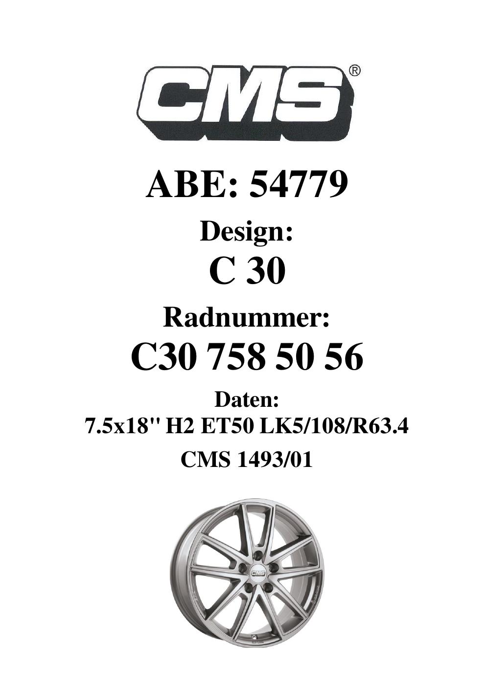Dieses Gutachten (ABE) bezieht sich auf die Alufelge CMS C30 in der Ausführung 7.5Jx18 ET 0, Mittenloch 0 mm (KBA 54779). Im PDF findest du typischerweise zulässige Reifengrößen, Auflagen/Anbauhinweise und – je nach Dokument – Hinweise zur Eintragung.
