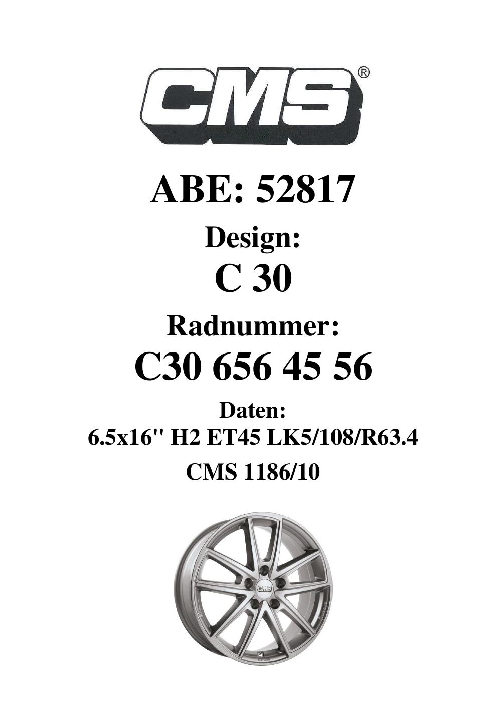 Dieses Gutachten (ABE) bezieht sich auf die Alufelge CMS C30 in der Ausführung 6.5Jx16 ET 0, Mittenloch 0 mm (KBA 52817). Im PDF findest du typischerweise zulässige Reifengrößen, Auflagen/Anbauhinweise und – je nach Dokument – Hinweise zur Eintragung.