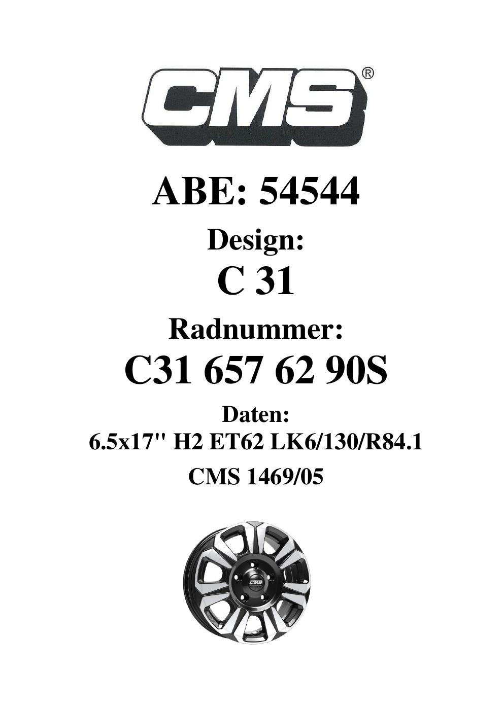 Dieses Gutachten (ABE) bezieht sich auf die Alufelge CMS C31 in der Ausführung 6.5Jx17 ET 0, Mittenloch 0 mm (KBA 54544). Im PDF findest du typischerweise zulässige Reifengrößen, Auflagen/Anbauhinweise und – je nach Dokument – Hinweise zur Eintragung.