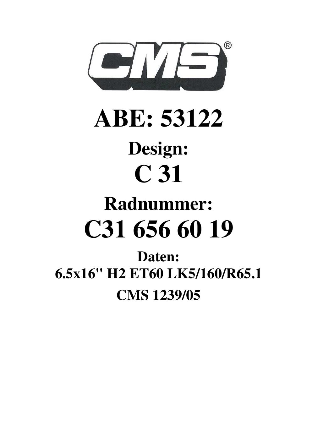 Dieses Gutachten (ABE) bezieht sich auf die Alufelge CMS C31 in der Ausführung 6.5Jx16 ET 0, Mittenloch 0 mm (KBA 53122). Im PDF findest du typischerweise zulässige Reifengrößen, Auflagen/Anbauhinweise und – je nach Dokument – Hinweise zur Eintragung.