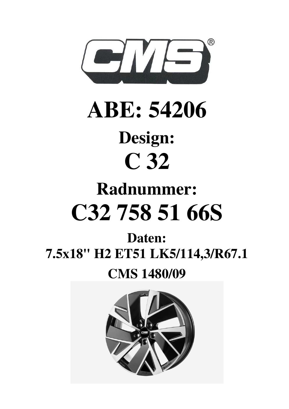 Dieses Gutachten (ABE) bezieht sich auf die Alufelge CMS C32 in der Ausführung 7.5Jx18 ET 0, Mittenloch 0 mm (KBA 54206). Im PDF findest du typischerweise zulässige Reifengrößen, Auflagen/Anbauhinweise und – je nach Dokument – Hinweise zur Eintragung.