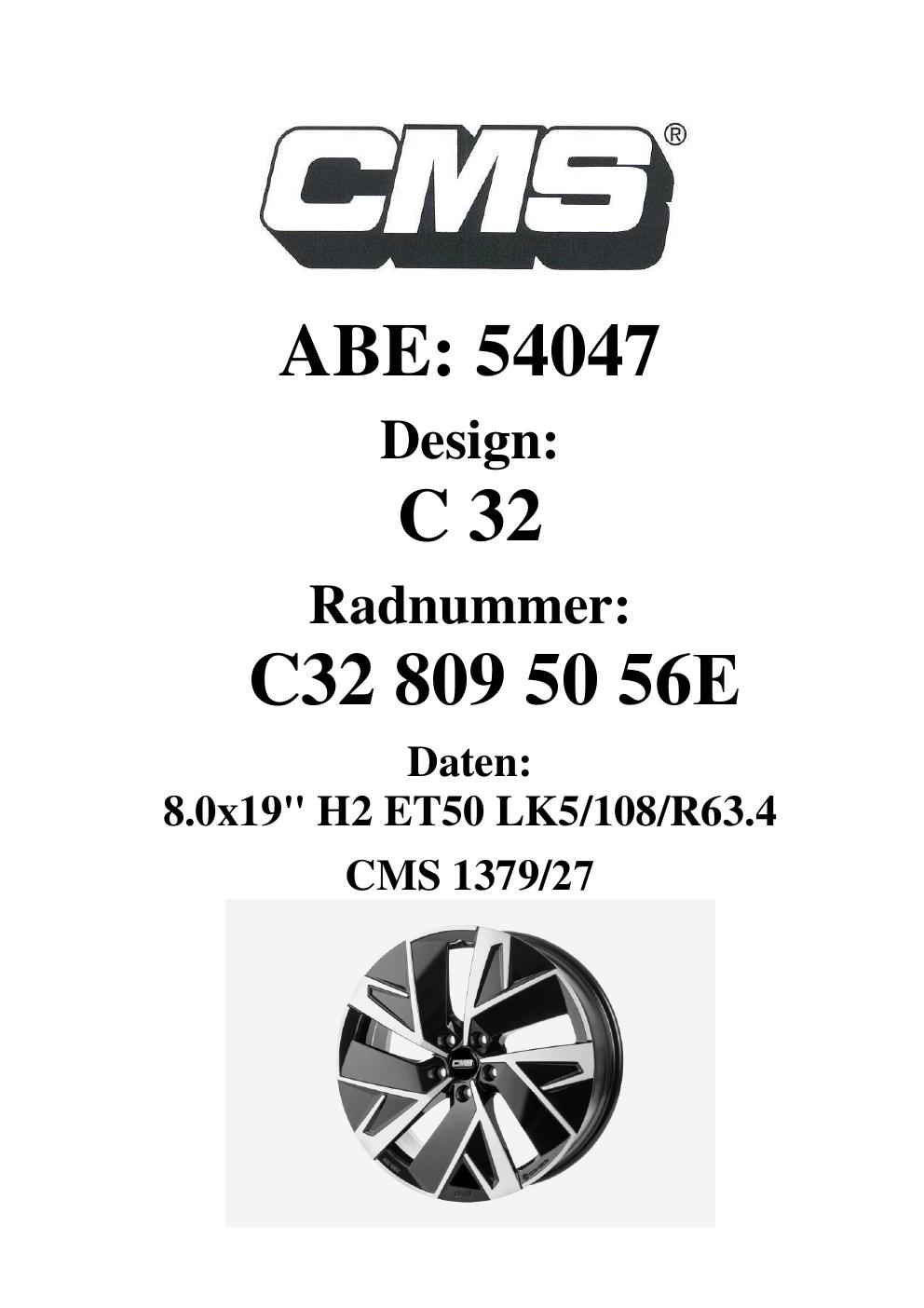 Dieses Gutachten (ABE) bezieht sich auf die Alufelge CMS C32 in der Ausführung 8Jx19 ET 0, Mittenloch 0 mm (KBA 54047). Im PDF findest du typischerweise zulässige Reifengrößen, Auflagen/Anbauhinweise und – je nach Dokument – Hinweise zur Eintragung.
