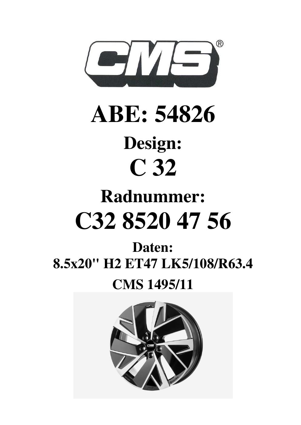 Dieses ABE gehört zur Felge CMS C32 in 8.5Jx2 ET0 mit KBA 54826. Die Seite ist dafür gedacht, dass du schnell prüfen kannst, ob KBA, Design und Größe zu deiner Felge passen und danach direkt das richtige PDF lädst.