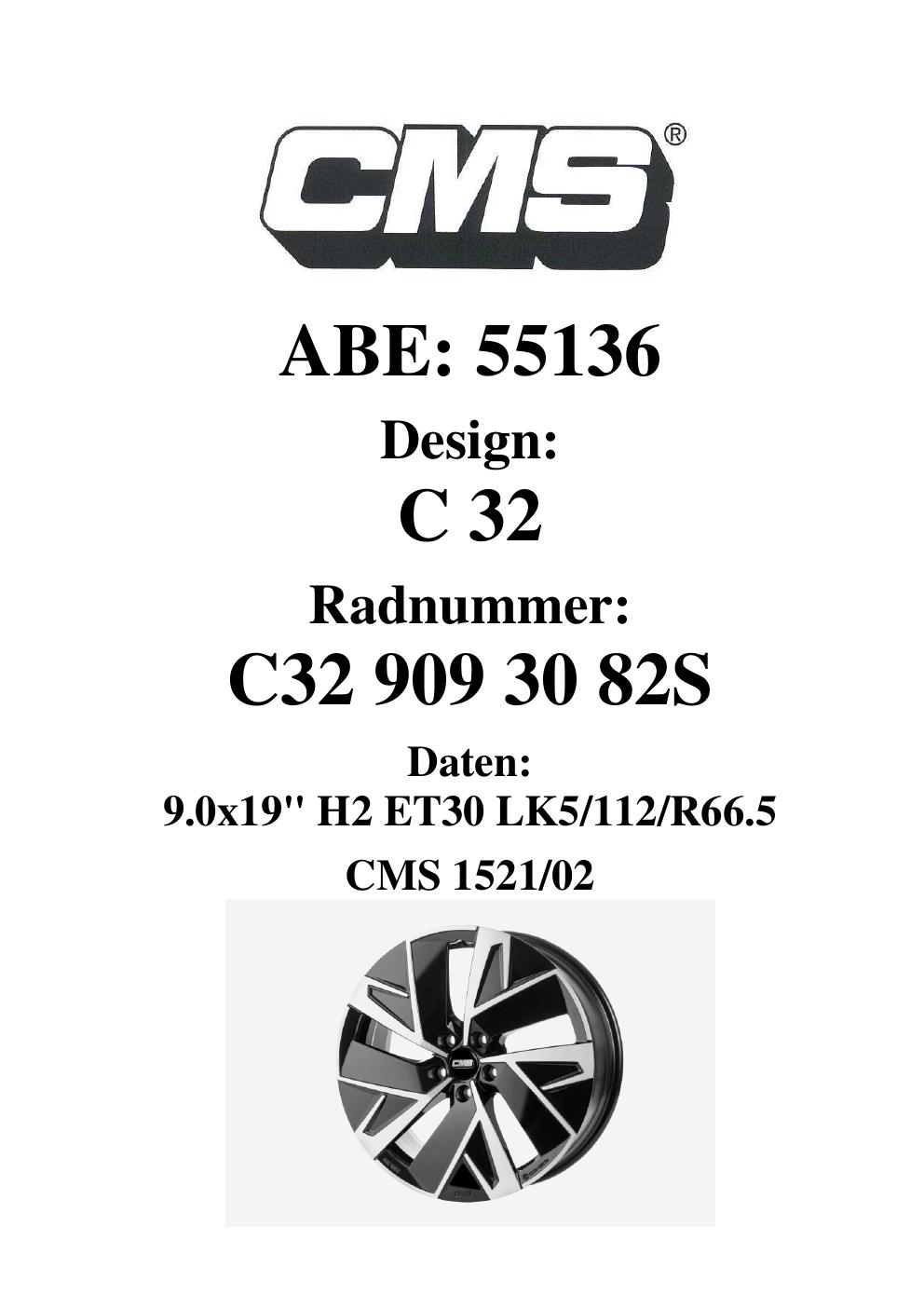 Dieses Gutachten (ABE) bezieht sich auf die Alufelge CMS C32 in der Ausführung 9Jx19 ET 0, Mittenloch 0 mm (KBA 55136). Im PDF findest du typischerweise zulässige Reifengrößen, Auflagen/Anbauhinweise und – je nach Dokument – Hinweise zur Eintragung.