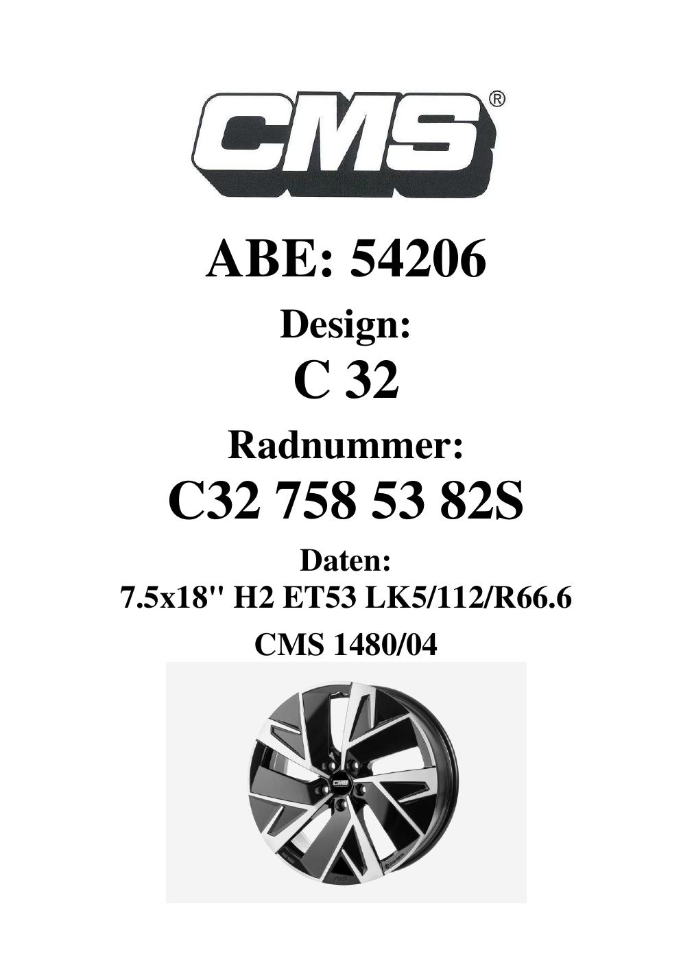 Dieses Gutachten (ABE) bezieht sich auf die Alufelge CMS C32 in der Ausführung 7.5Jx18 ET 0, Mittenloch 0 mm (KBA 54206). Im PDF findest du typischerweise zulässige Reifengrößen, Auflagen/Anbauhinweise und – je nach Dokument – Hinweise zur Eintragung.