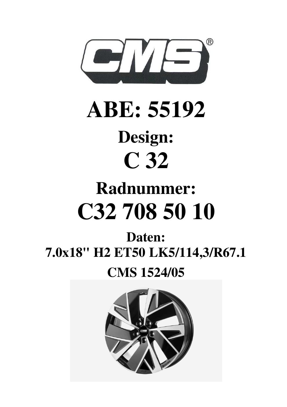 Dieses Gutachten (ABE) bezieht sich auf die Alufelge CMS C32 in der Ausführung 7Jx18 ET 0, Mittenloch 0 mm (KBA 55192). Im PDF findest du typischerweise zulässige Reifengrößen, Auflagen/Anbauhinweise und – je nach Dokument – Hinweise zur Eintragung.