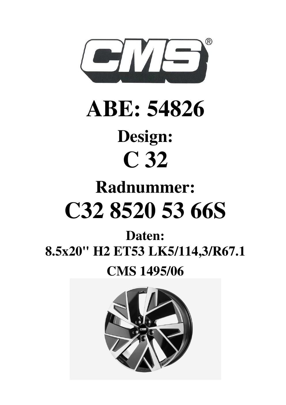 Dieses Gutachten (ABE) bezieht sich auf die Alufelge CMS C32 in der Ausführung 8.5Jx2 ET 0, Mittenloch 0 mm (KBA 54826). Im PDF findest du typischerweise zulässige Reifengrößen, Auflagen/Anbauhinweise und – je nach Dokument – Hinweise zur Eintragung.