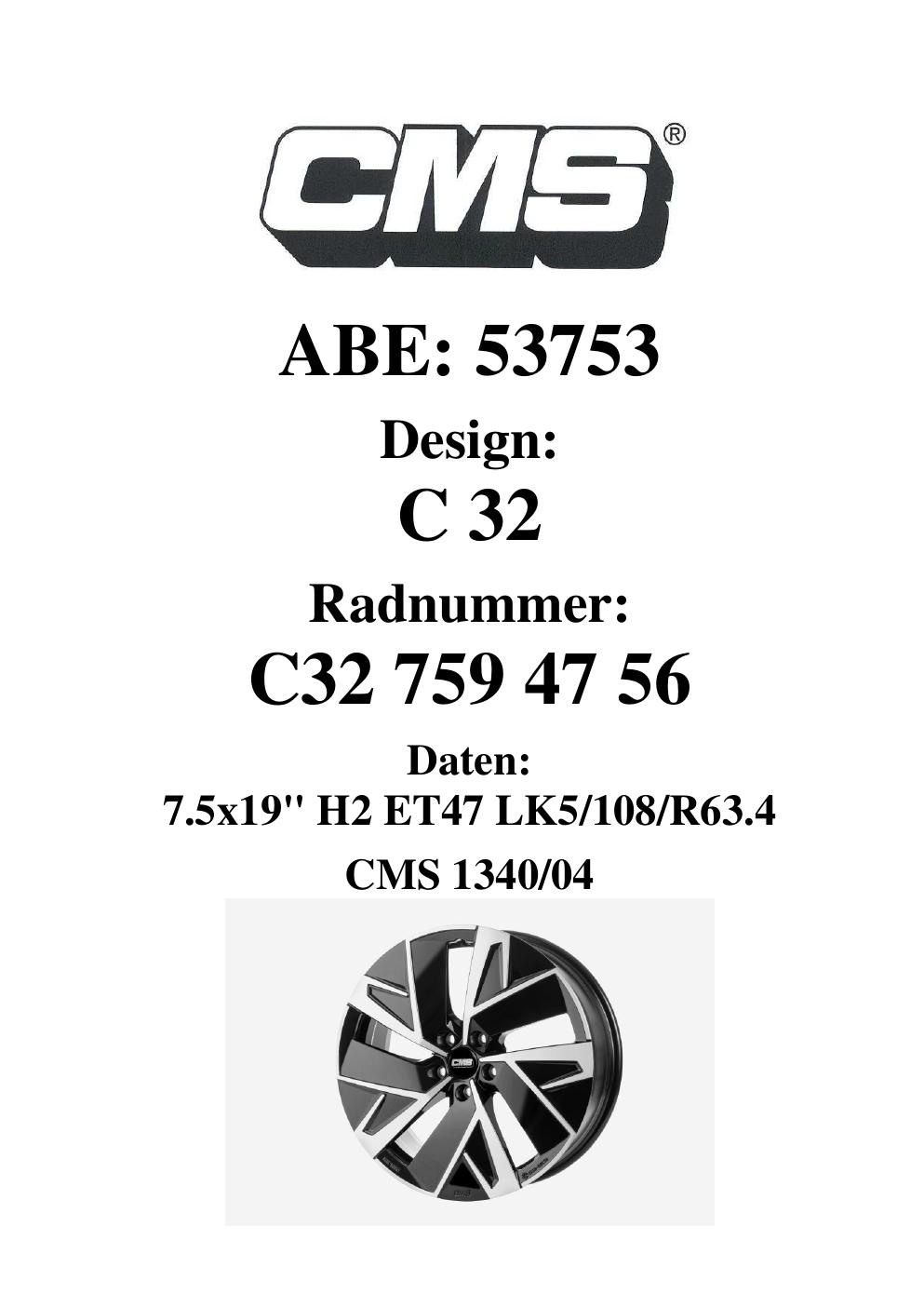 Dieses Gutachten (ABE) bezieht sich auf die Alufelge CMS C32 in der Ausführung 7.5Jx19 ET 0, Mittenloch 0 mm (KBA 53753). Im PDF findest du typischerweise zulässige Reifengrößen, Auflagen/Anbauhinweise und – je nach Dokument – Hinweise zur Eintragung.