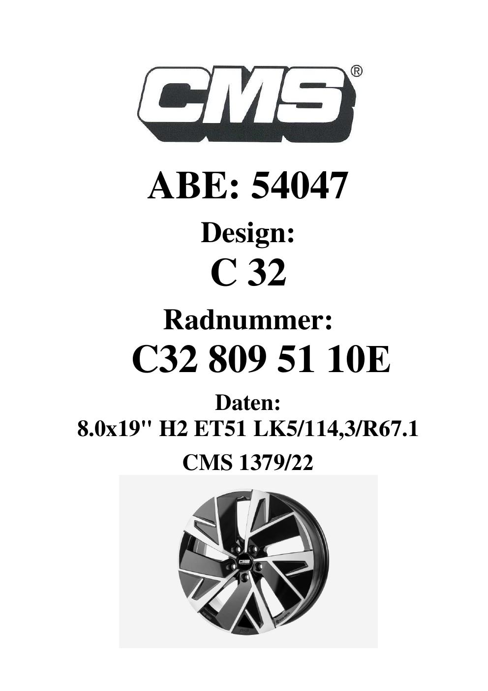 Dieses ABE gehört zur Felge CMS C32 in 8Jx19 ET0 mit KBA 54047. Die Seite ist dafür gedacht, dass du schnell prüfen kannst, ob KBA, Design und Größe zu deiner Felge passen und danach direkt das richtige PDF lädst.