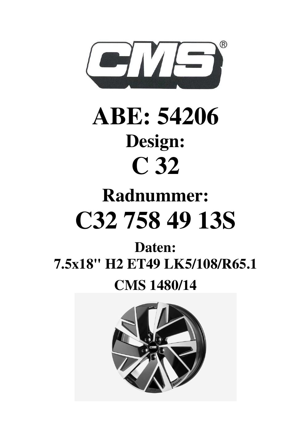 Dieses Gutachten (ABE) bezieht sich auf die Alufelge CMS C32 in der Ausführung 7.5Jx18 ET 0, Mittenloch 0 mm (KBA 54206). Im PDF findest du typischerweise zulässige Reifengrößen, Auflagen/Anbauhinweise und – je nach Dokument – Hinweise zur Eintragung.