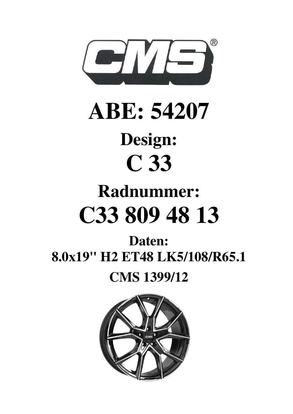 Dieses Gutachten (ABE) bezieht sich auf die Alufelge CMS C33 in der Ausführung 8Jx19 ET 0, Mittenloch 0 mm (KBA 54207). Im PDF findest du typischerweise zulässige Reifengrößen, Auflagen/Anbauhinweise und – je nach Dokument – Hinweise zur Eintragung.