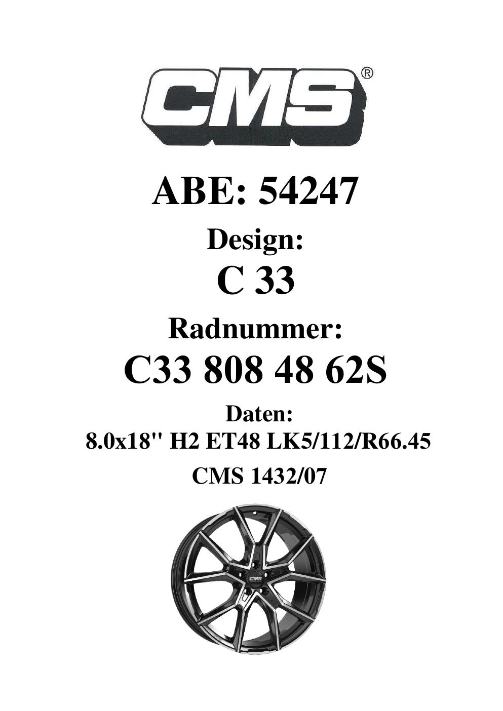 Dieses ABE gehört zur Felge CMS C33 in 8Jx18 ET0 mit KBA 54247. Die Seite ist dafür gedacht, dass du schnell prüfen kannst, ob KBA, Design und Größe zu deiner Felge passen und danach direkt das richtige PDF lädst.