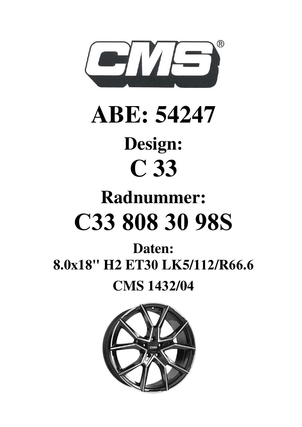 Dieses Gutachten (ABE) bezieht sich auf die Alufelge CMS C33 in der Ausführung 8Jx18 ET 0, Mittenloch 0 mm (KBA 54247). Im PDF findest du typischerweise zulässige Reifengrößen, Auflagen/Anbauhinweise und – je nach Dokument – Hinweise zur Eintragung.