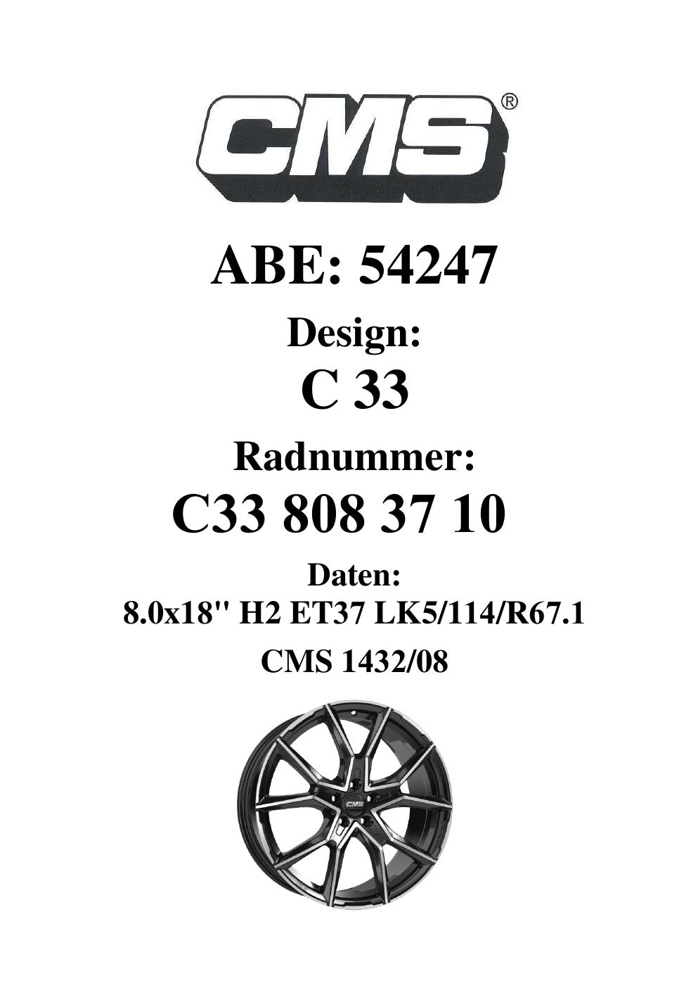 Dieses Gutachten (ABE) bezieht sich auf die Alufelge CMS C33 in der Ausführung 8Jx18 ET 0, Mittenloch 0 mm (KBA 54247). Im PDF findest du typischerweise zulässige Reifengrößen, Auflagen/Anbauhinweise und – je nach Dokument – Hinweise zur Eintragung.