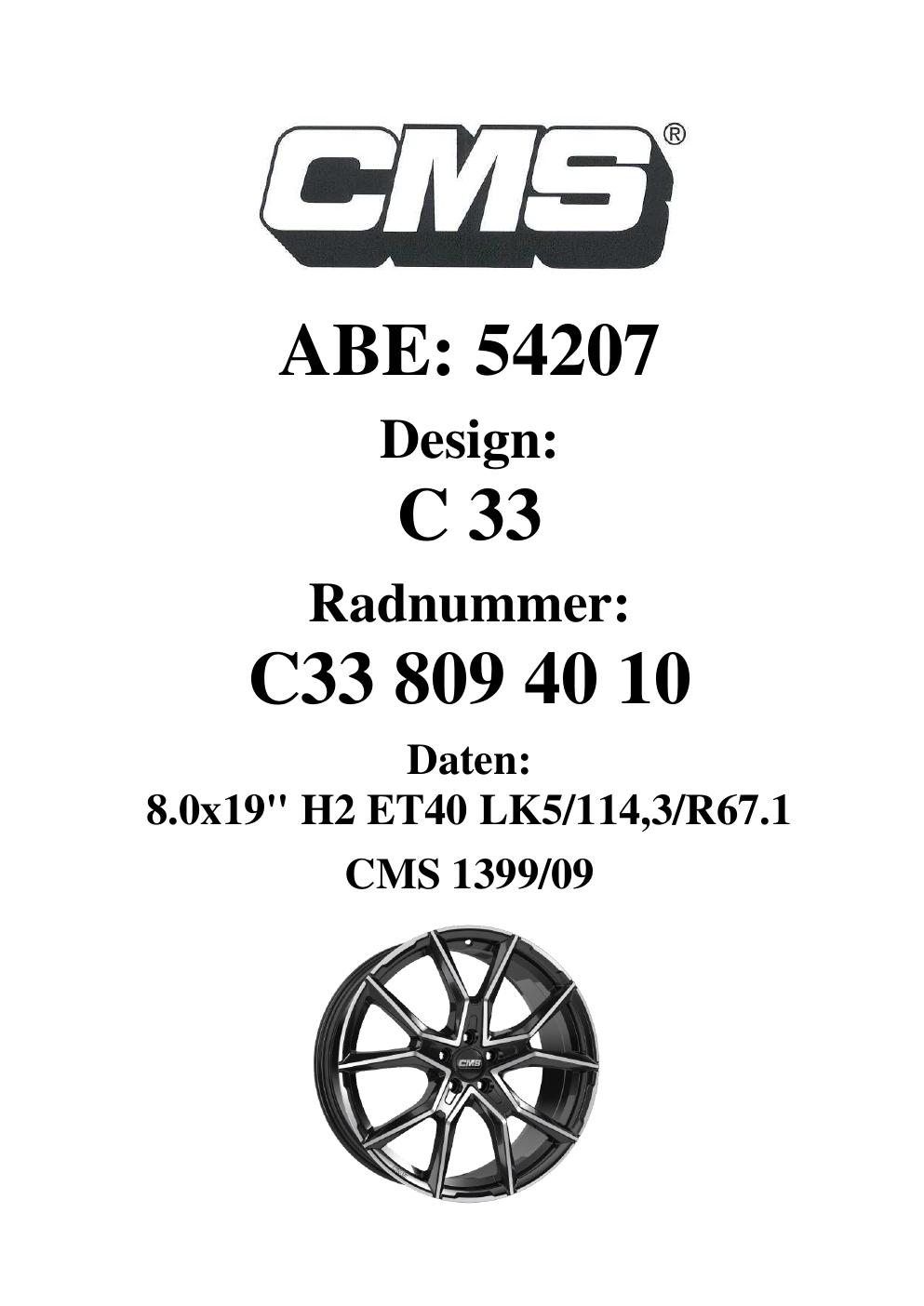 Dieses Gutachten (ABE) bezieht sich auf die Alufelge CMS C33 in der Ausführung 8Jx19 ET 0, Mittenloch 0 mm (KBA 54207). Im PDF findest du typischerweise zulässige Reifengrößen, Auflagen/Anbauhinweise und – je nach Dokument – Hinweise zur Eintragung.