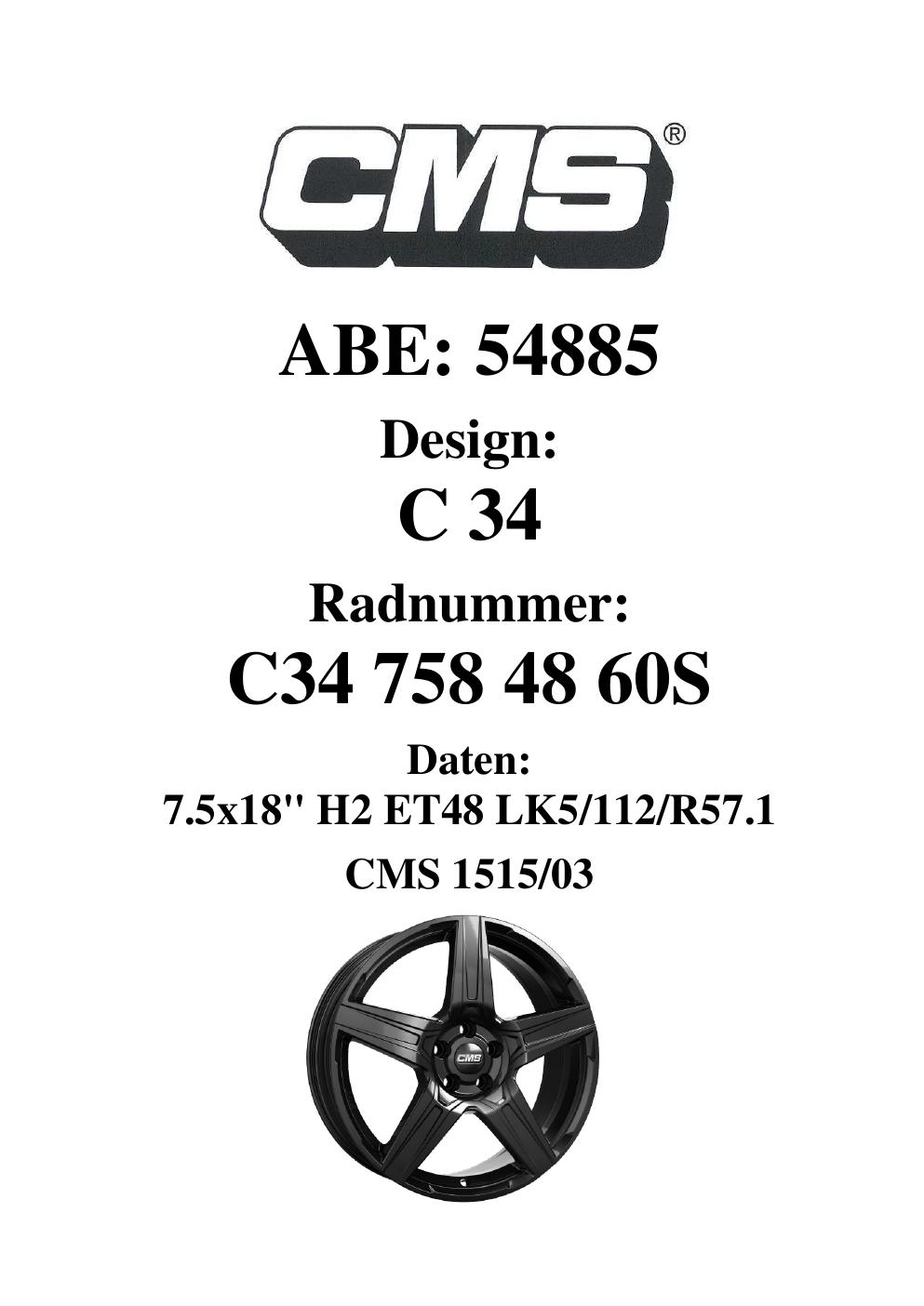 Dieses Gutachten (ABE) bezieht sich auf die Alufelge CMS C34 in der Ausführung 7.5Jx18 ET 0, Mittenloch 0 mm (KBA 54885). Im PDF findest du typischerweise zulässige Reifengrößen, Auflagen/Anbauhinweise und – je nach Dokument – Hinweise zur Eintragung.