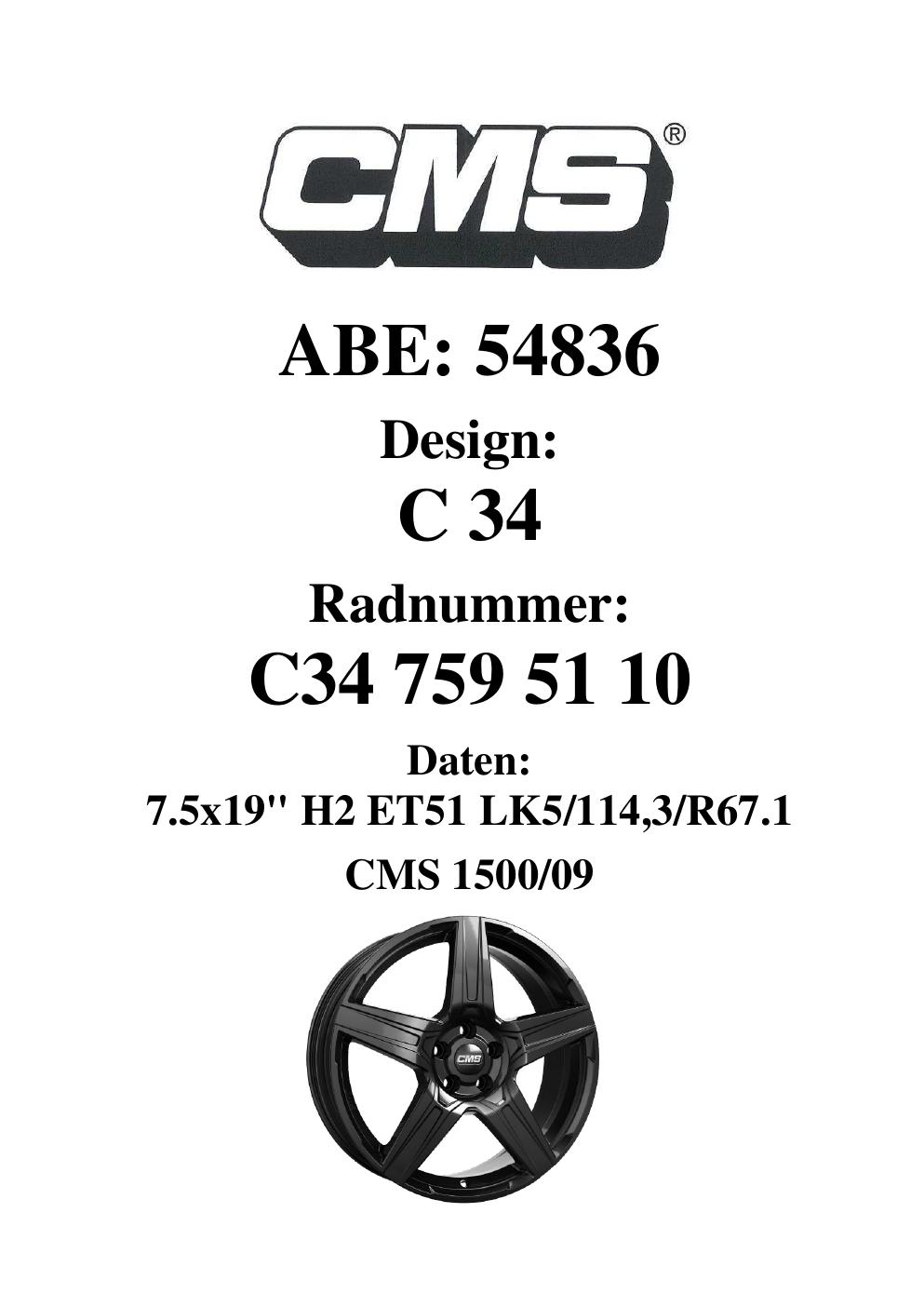 Dieses Gutachten (ABE) bezieht sich auf die Alufelge CMS C34 in der Ausführung 7.5Jx19 ET 0, Mittenloch 0 mm (KBA 54836). Im PDF findest du typischerweise zulässige Reifengrößen, Auflagen/Anbauhinweise und – je nach Dokument – Hinweise zur Eintragung.