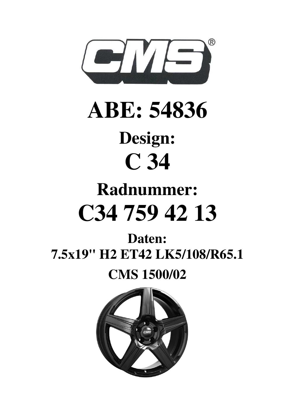 Dieses Gutachten (ABE) bezieht sich auf die Alufelge CMS C34 in der Ausführung 7.5Jx19 ET 0, Mittenloch 0 mm (KBA 54836). Im PDF findest du typischerweise zulässige Reifengrößen, Auflagen/Anbauhinweise und – je nach Dokument – Hinweise zur Eintragung.