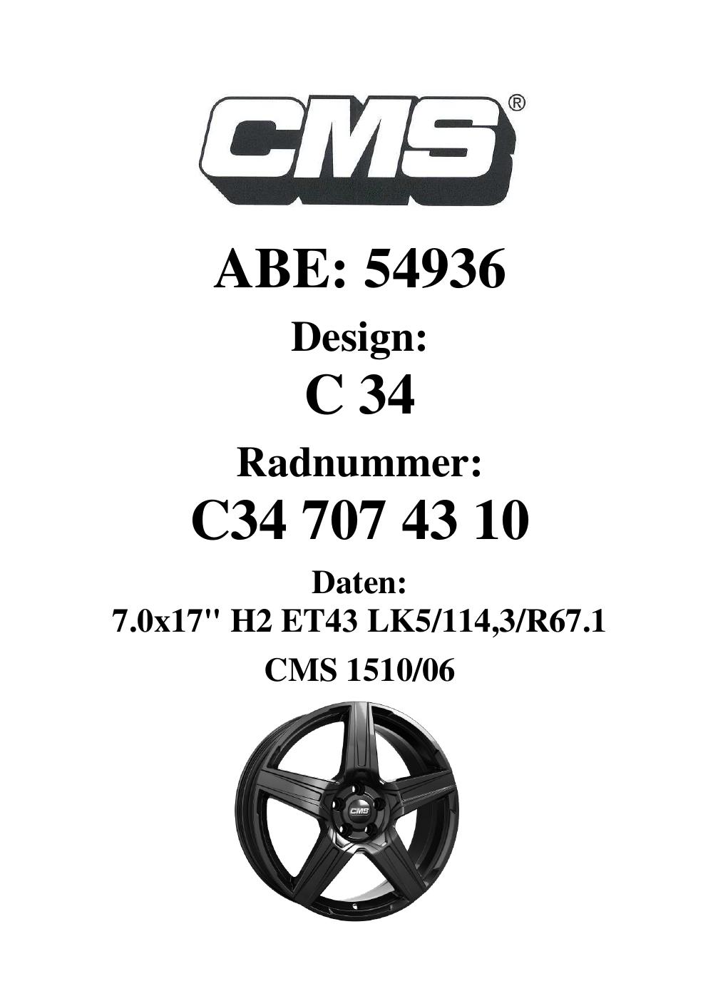 Dieses Gutachten (ABE) bezieht sich auf die Alufelge CMS C34 in der Ausführung 7Jx17 ET 0, Mittenloch 0 mm (KBA 54936). Im PDF findest du typischerweise zulässige Reifengrößen, Auflagen/Anbauhinweise und – je nach Dokument – Hinweise zur Eintragung.