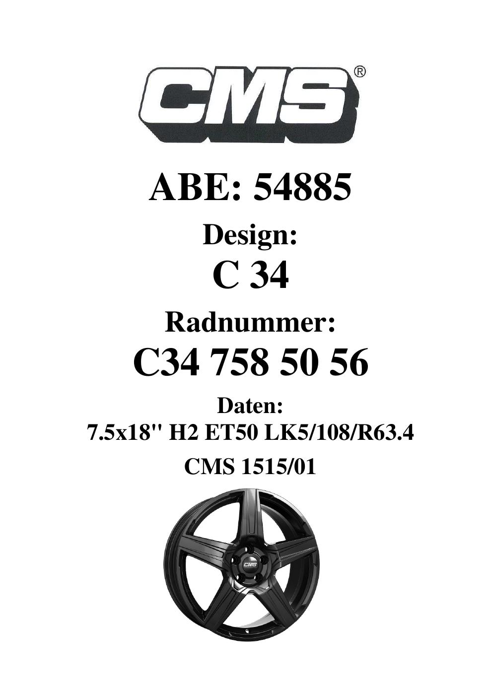 Dieses Gutachten (ABE) bezieht sich auf die Alufelge CMS C34 in der Ausführung 7.5Jx18 ET 0, Mittenloch 0 mm (KBA 54885). Im PDF findest du typischerweise zulässige Reifengrößen, Auflagen/Anbauhinweise und – je nach Dokument – Hinweise zur Eintragung.