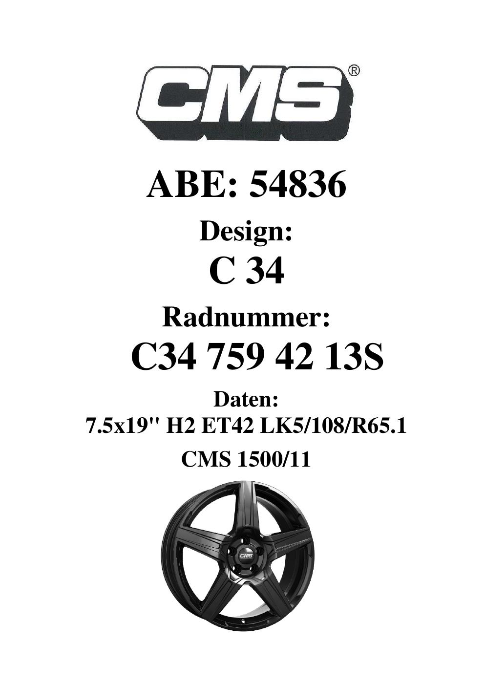 Dieses Gutachten (ABE) bezieht sich auf die Alufelge CMS C34 in der Ausführung 7.5Jx19 ET 0, Mittenloch 0 mm (KBA 54836). Im PDF findest du typischerweise zulässige Reifengrößen, Auflagen/Anbauhinweise und – je nach Dokument – Hinweise zur Eintragung.